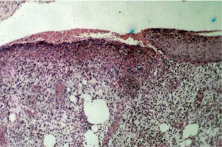 Histological preparation of the split skin graft donor site after 6 days. There is no epithelial budding and the connective tissue shows macrophages, and young thick fibroblasts without significant collagen production (haematoxylin and eosin stain, original magnification: x10).